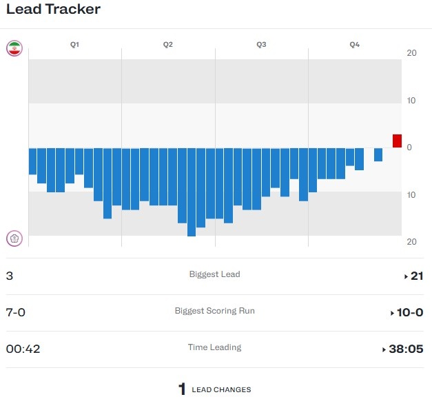 比赛数据显示,中国台北队掌控局面长达38分05秒,但伊朗队在最后关头实现比分反超。整场比赛双方领先优势仅交替1次,伊朗队全场领先时间仅有42秒。