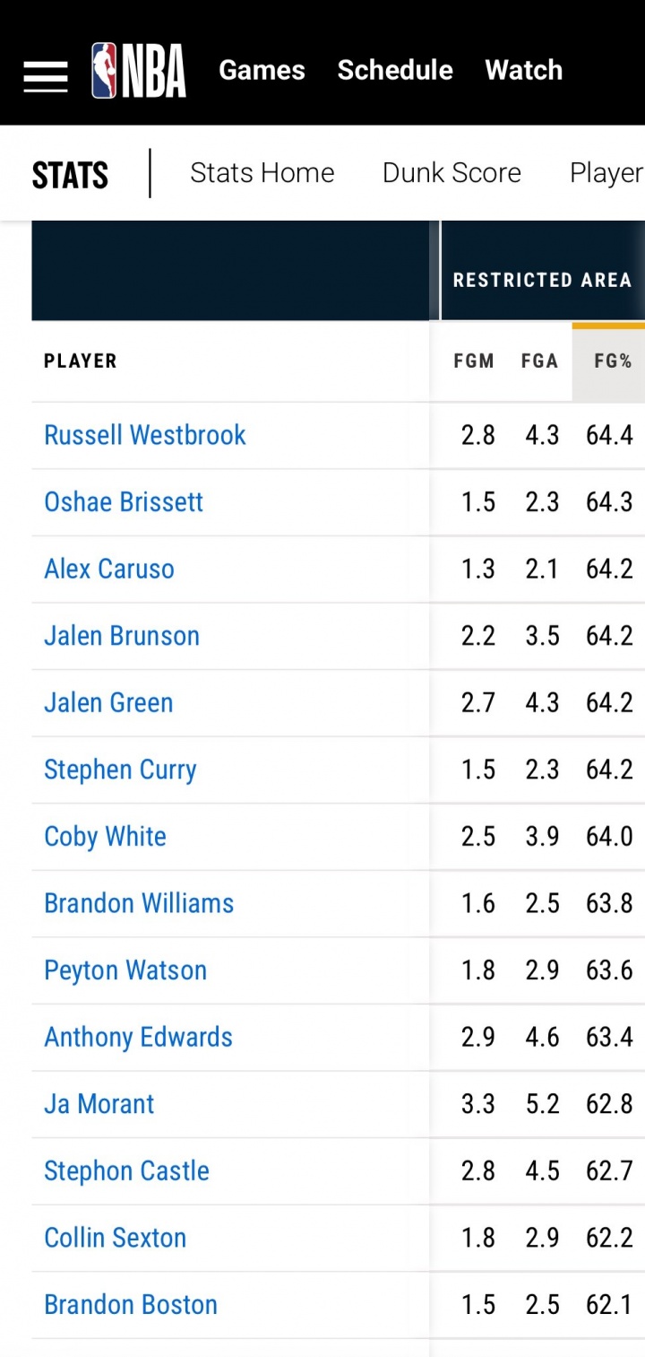 上赛季各后卫的禁区命中率