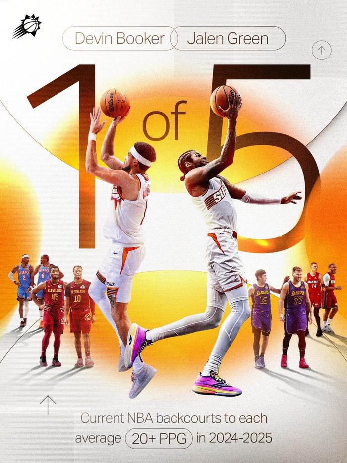 太阳对未来的核心应该很有信心吧,他们今天还在社交媒体上宣传,布克和杰伦-格林是目前NBA后场组合里,仅有的两人各自都能场均砍下20+的五组搭档之一。