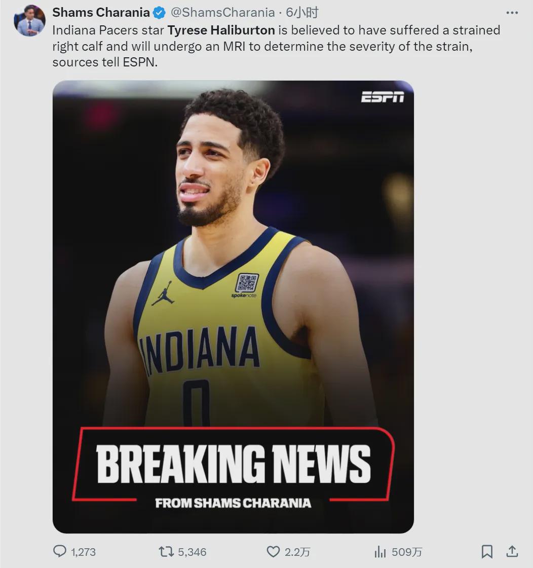 北京时间6月18日,据NBA名记Shams报道,哈利伯顿右小腿拉伤不容乐观,今天他将接受MRI(核磁共振检查),来确定拉伤程度。等到检查结果出来,才能知道哈利伯顿能不能出战G6。哈利伯顿希望带伤出战,步行者比较谨慎。